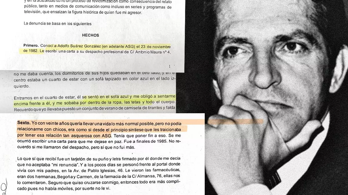 Una mujer presentó a comienzos de diciembre ante la Unidad de Atención a la Familia y Mujer (UFAM) de la Policía Nacional una denuncia por agresión sexual contra el expresidente del Gobierno Adolfo Suárez. La denuncia, a la que ha tenido acceso elDiario.es, describe con detalle hechos que sucedieron entre los años 1982 y 1985. El primer episodio de agresión que relata ocurrió cuando ella tenía 17 años y Suárez, 50. “Necesité muchísimos años de terapia para procesar el trauma y eliminar el dolor al hablar, ahora me siento segura y arropada. En aquellos momentos era implanteable denunciar y menos a un personaje así. Cuando muere su agresor, las víctimas suelen descansar, en mi caso ha sido lo contrario: fue morir y ponerle el nombre al aeropuerto, hacerle un héroe nacional, encontrarme imágenes por todas partes y ahora la serie... oigo hablar de ella y de él a todas horas, ya no puedo más”, explica Ariadna, nombre ficticio, en conversación con este medio.